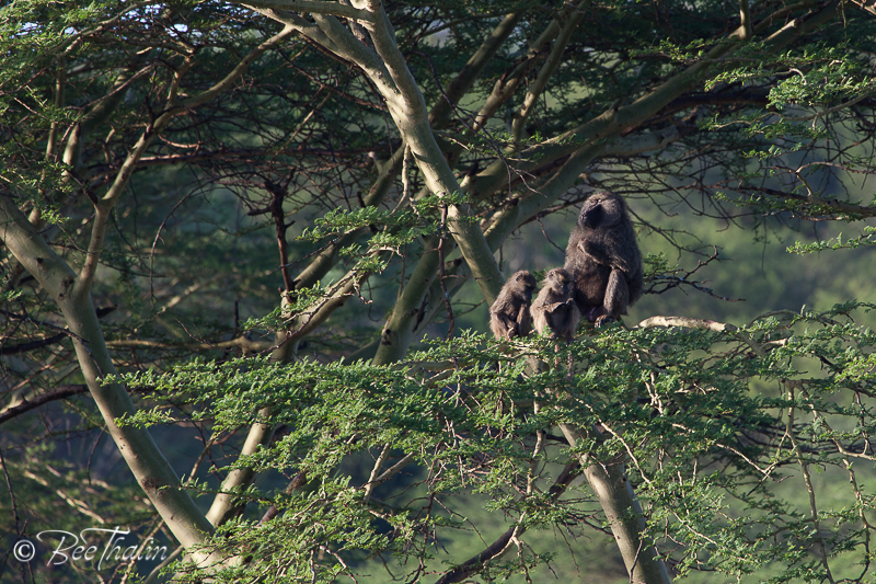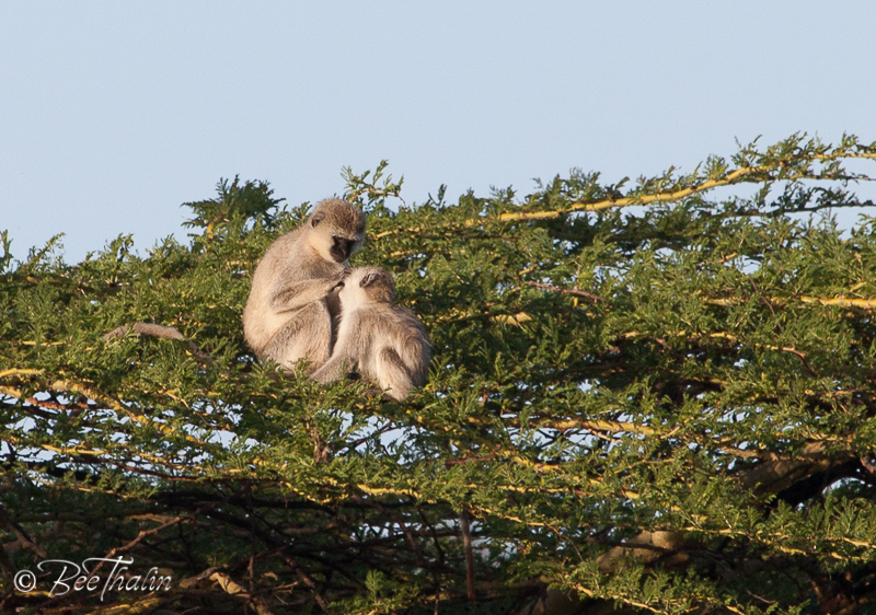 Långt bort såg vi några apor som satt och gjorde morgontoalett – på varandra